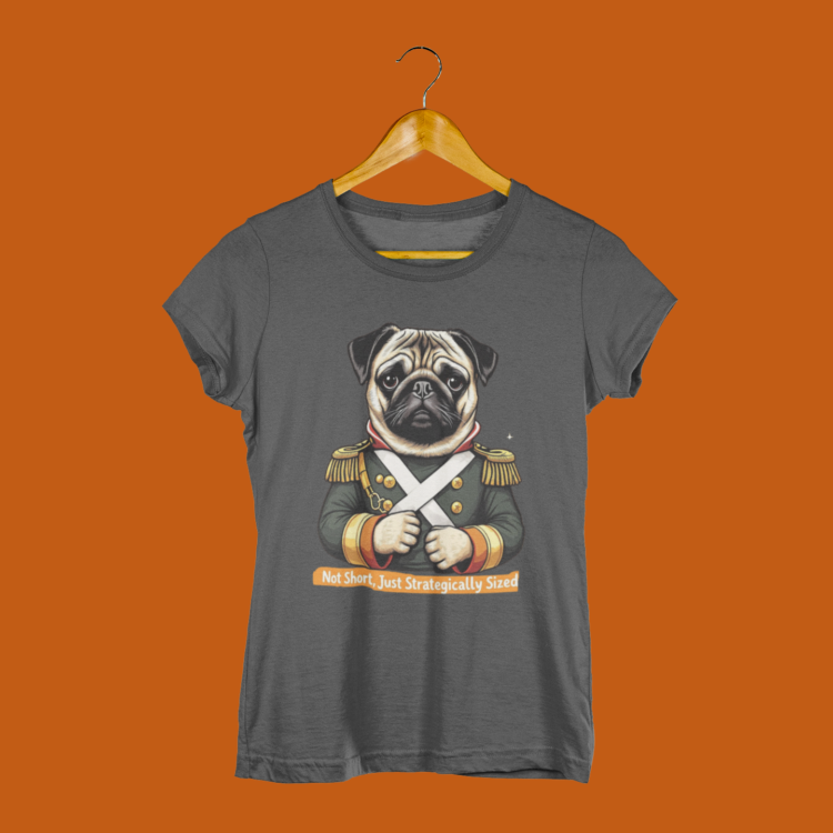 Hilarious Napoleon pug design for dog lovers and history buffs! Features a regal pug in a military uniform with the phrase “Not Short, Just Strategically Sized.” Great for pug owners, funny dog humor fans, and sarcastic pet lovers.