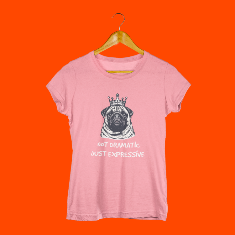 Funny pug design featuring a crowned pug with the phrase “Not Dramatic, Just Expressive.” Perfect for pug lovers, dog owners, pet parents, and fans of sarcastic dog humor, royal pet designs, and expressive dog breeds.
